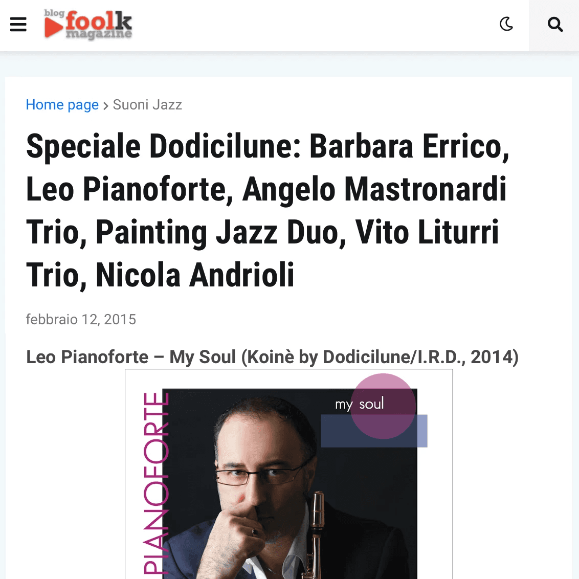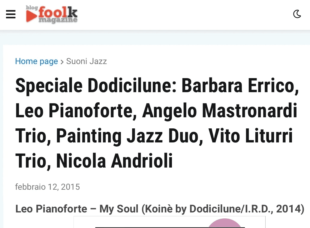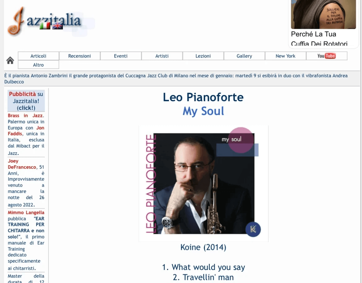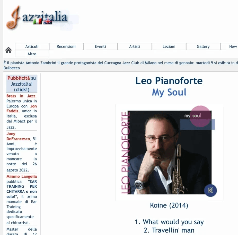 Distributed in Italy and internationally through the IRD circuit and major digital stores, My Soul is a recording project by Leo Pianoforte, produced by Koinè and released as part of the editorial series of the Salento-based label Dodicilune.